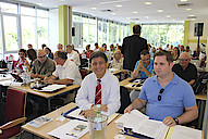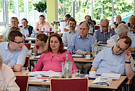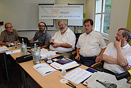 Tagungspräsidium bestens vertreten durch Thorsten Becker (l.) und Norbert Dörholt (r.), davor der Vorstand mit Jörg Steinbach, Dr. Gabriela Blumschein-Grossmayer, Geschäftsführer Achim Wolff, 1. Vorsitzender Hans U. Heuser und Vorstandsmitglied Harro Menzel ((v.l.n.r.). Foto: Sonja Lehnert