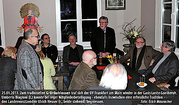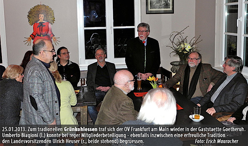 Zum traditionellen Grünkohlessen traf sich der Ortsverband Frankfurt am Main wieder in der Gaststätte Goetheruh. Ortsverbandsvorsitzender Umberto Biagioni (l.) konnte bei reger Beteiligung der Mitglieder - ebenfalls eine erfreuliche Tradition - den Landesvorsitzenden Ulrich Heuser (beide stehend, r.) begrüßen. Foto: Erich Mauracher