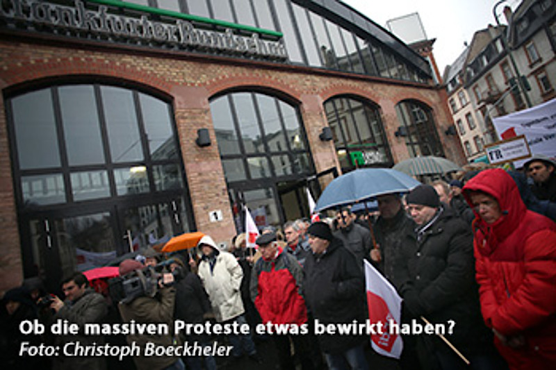 Für den Fall, dass die Behörde als grünes Licht zur Übernahme durch die "FAZ" gibt, will diese laut "FR"-Betriebsrat allerdings nur 28 Mitarbeiter aus der Redaktion übernehmen und den Titel weiterführen, an der Druckerei besteht kein Interesse. Das Druck- und Verlagshaus Frankfurt hat aber 450 Beschäftigte. Konkret bedeutet das: etwa 400 Menschen werden arbeitslos bzw. mit ungewisser Zukunft in eine zu bildende Transfergesellschaft übernommen. Viele haben inzwischen auch ihre Kündigungen erhalten.