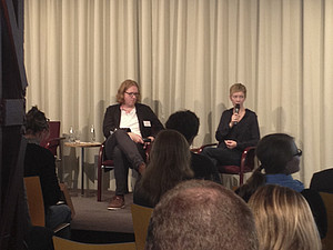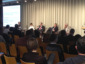 ![]() | Das Abschlusspodium diskutierte über die Entscheidung des EuGH: Recherchefreiheit vs. Recht auf Vergessen. Auf dem Podium v.l.n.r.: Dr. Rolf Bremer, Unternehmenssprecher von Google Deutschland, Lorena Jaume-PalasÃ, Dozentin für Rechtsphilosophie, Moderator Alexander Fritsch, Vorsitzender JVBB und freier Journalist, Sabine, Leutheusser-Schnarrenberger, Google Beirat, ehemalige Bundesministerium der Justiz und für Verbraucherschutz, und Dr. Thilo Weichert, Landesbeauftragter für den Datenschutz Schleswig-Holstein. Fotos: Sonja Lehnert |