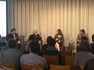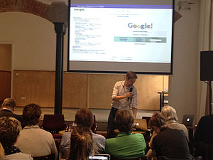 | Crowdfunding praktisch erklärt von Lisa Altmeier und Steffi Fetz (2.v.r., r.), TV-Autorinnen beim BR, Dr. Andreas Bittner, freier Journalist (l.), moderierte. | Peter Isemann, Device Specialist bei Google, gab Ratschläge für die Online-Recherche. |