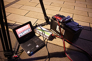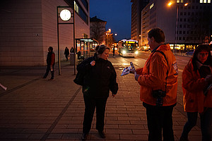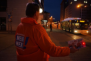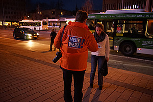 Zahlreiche Passanten blieben während der etwa einstündigen Show vor den hellerleuchteten Häuserfassaden stehen. Dort verteilten die Aktivisten des Ortsverbandes Gießen die neueste Ausgabe der Zeitung „Pranger" und diskutierten mit Bürgerinnen und Bürgern.