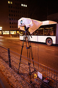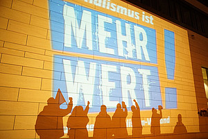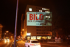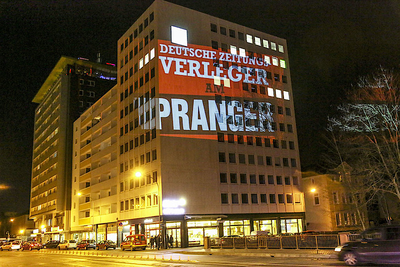 Gießen, 25. Februar 2014 – Der Deutsche Journalisten Verband (DJV) Hessen machte mit einer außergewöhnlichen Aktion am Dienstagabend am Gießener Rathaus auf Umstände aufmerksam, denen Redakteurinnen und Redakteure auch in hessischen Verlagen ohne Tarifbindung wie dem Gießener Anzeiger und der Gießener Allgemeine ausgesetzt sind. Dort, wo keine Tarifverträge mehr gelten, werden die Redakteure mit Niedriggehältern abgespeist und Freie erhalten ein Minimalhonorar, das nicht zum Überleben reicht. Die Bildsequenzen einer Video-Show zeigten überdimensional an Hausfassaden, warum tariflose Arbeitsbedingungen mit hochwertigem Zeitungsjournalismus unvereinbar sind.