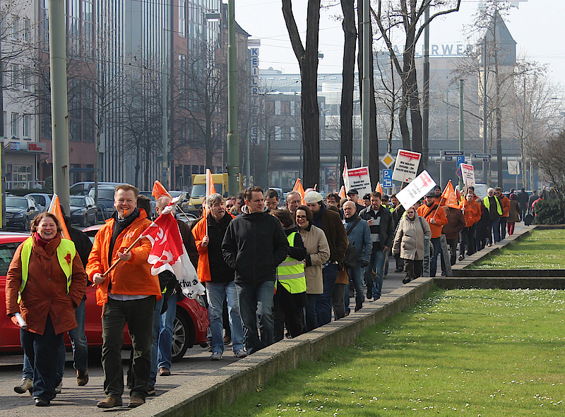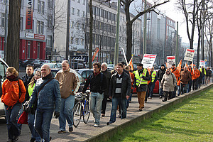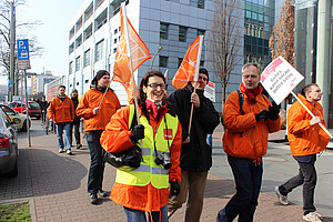 Die Demonstranten zogen mit Trillerpfeifen und Fahnen durch Frankfurts Straßen bis zum DGB-Haus, wo über weitere Streiktage diskutiert wurde. sl