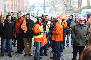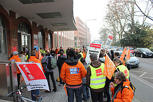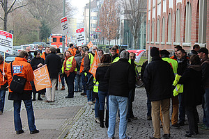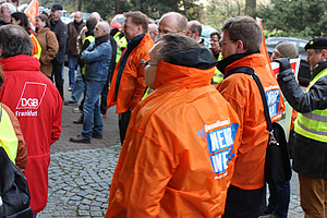 Frankfurt, 6. März 2014 – Vor dem Verlagsgebäude der Frankfurter Neuen Presse in Frankfurt a.M. versammelten sich am Vormittag gut 100 Redakteurinnen und Redakteure. Kolleginnen und Kollegen des Darmstädter Echos und seiner Außenstellen, der Frankfurter Rundschau und des Pressedienstes Frankfurt stießen dazu.