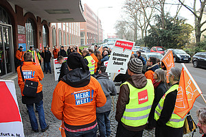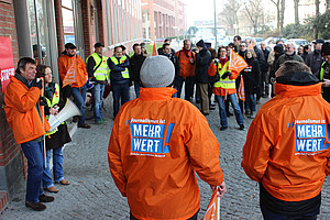 „Die Arbeitskampfmaßnahmen hier in Hessen und in den anderen Bundesländern stärken den Verhandelnden am 8. März in Hamburg den Rücken.“ Mit diesen Worten unterstützte auch Cornelia Haß, Bundesgeschäftsführerin der dju, die Streikenden. Die Forderung nach deutlicher Anhebung der Gehälter bzw. Honorare für die rund 14.000 Journalistinnen und Journalisten an Tageszeitungen sowie nach der Einbindung der Onliner in die Tarifverträge bekräftigten die Streikenden und erteilten dem ,Tarifwerk Zumutung’ des BDZV eine klare Absage.
