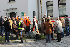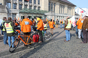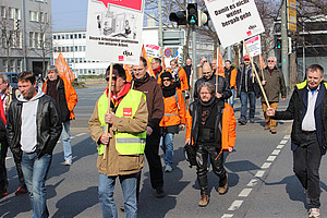 Um 10 Uhr trafen sich etwa 40 Streikende vor dem Verlagsgebäude in der Holzhofallee, um anschließend Kolleginnen und Kollegen aus Frankfurt vom Bahnhof abzuholen und gemeinsam zum Gewerkschaftshaus zu ziehen. Redakteurinnen und Redakteure der Frankfurter Neuen Presse hatten sich gestern spontan entschlossen, ebenfalls einen zweiten Tag, gemeinsam mit den Darmstädter Kollegen, zu streiken.