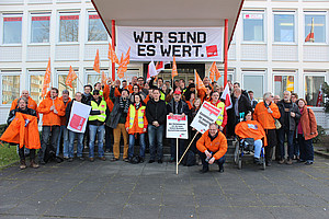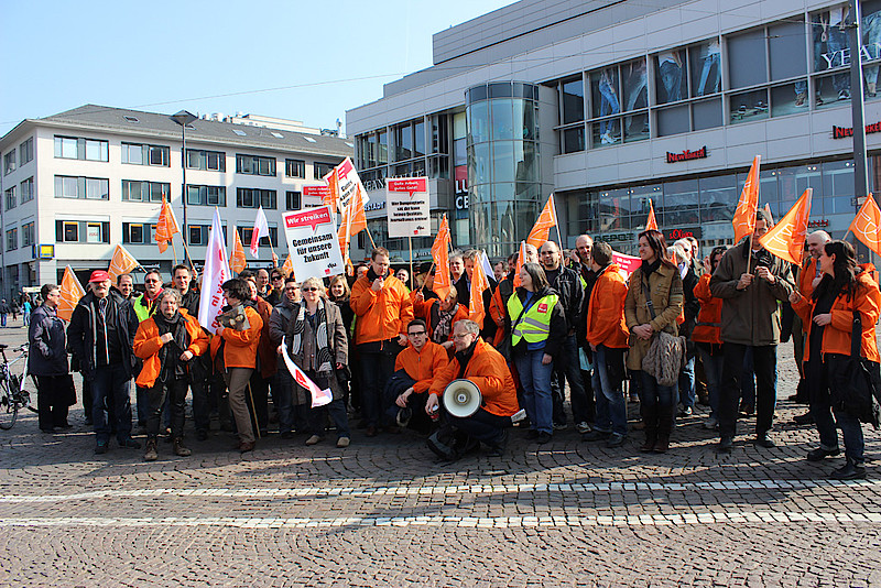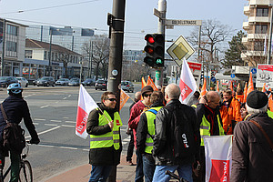 Im Anschluss an die Versammlung im Gewerkschaftshaus zogen die Streikenden weiter zum Luisenplatz, wo auch Bürgerinnen und Bürger auf die Streiksituation aufmerksam gemacht wurden. sl