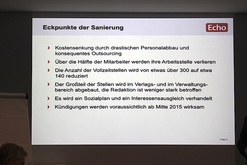 Nach dem von den Wirtschaftsprüfern vorgestellten Zahlenmaterial muss die Belegschaft um mehr als die Hälfte reduziert werden, Arbeiten werden an Dritte vergeben und Abteilungen ausgegliedert. Zudem werde man sich vom Traditionsstandort in der Holzhofallee verabschieden. Das Gebäude werde Anfang 2016 veräußert, der Standort des City-Echos verkleinert und die Außenredaktionen in Darmstadt und Dieburg sowie die in Rüsselsheim, Groß-Gerau und im Ried zusammengelegt. Erhalten bleiben Heppenheim und Erbach.