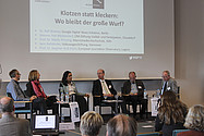 | Podiumsrunde, moderiert von Werner Lauff (r.) | Zum Abschluss das Resümee von Ulrike Kaiser, Sprecherin der Initiative Qualität. | Veranstaltungsort war wieder das Funkhaus des Deutschlandradios Berlin. Fotos: Sonja Lehnert |