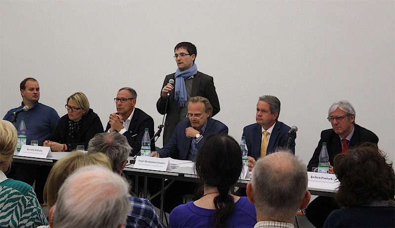 Paul-Hermann Gruner, Autor und Echo-Redakteur, moderierte die Diskussion, an der Jochen Partsch, Oberbürgermeister der Stadt Darmstadt, Matthias Wilkes, Landrat des Kreises Bergstraße, Rüdiger Fritsch, Präsident des SV Darmstadt 98, Kerstin Schultz, Vorsitzende des Architektursommers Rhein-Main und Jonas Zipf, Schauspieldirektor des Staatstheaters Darmstadt, teilnahmen.