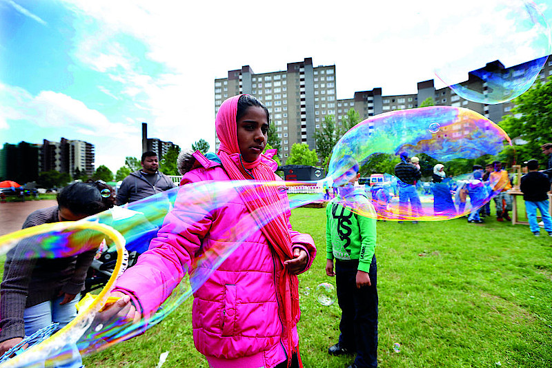 Motivbeschreibung: Stadtteilfest im Südhessischen Darmstadt-Kranichstein. Hier ist im multikulturellen Einzugsgebiet Einwanderermädchen Rija zu sehen. Für einen Augenblick stand sie außerhalb jeglicher Probleme. Ihre bunte Riesenseifenblase ist Symbolträger der Hoffnung aller Migranten auf ein besseres Leben.