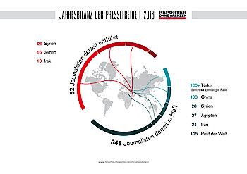 Die Zahl der wegen ihrer Arbeit verhafteten und entführten Journalisten ist hingegen gestiegen. Zum Stichtag 1. Dezember zählte ROG mindestens 348 inhaftierte Medienschaffende (darunter Journalisten, Bürgerjournalisten und Medienmitarbeiter), sechs Prozent mehr als ein Jahr zuvor – die meisten von ihnen in der Türkei, in China, Syrien, Ägypten und Iran. Entführt waren zu diesem Zeitpunkt 52 Medienschaffende, ausnahmslos in Syrien, im Jemen oder im Irak. 21 von ihnen befinden sich in der Gewalt der Terrororganisation „Islamischer Staat“. ROG