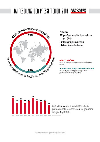 Den deutlichen Rückgang der Zahlen im Vergleich zum Vorjahr, in dem 101 Medienschaffende, darunter 67 professionelle Journalisten getötet worden sind, erklärt ROG mit dem Umstand, dass aus einigen Ländern viele Journalisten geflohen seien, weil die Fortsetzung ihrer Arbeit dort zu gefährlich gewesen wäre. In Ländern mit akuten politischen Konflikten wie Syrien, dem Irak, Libyen, dem Jemen, Afghanistan und Burundi fehlten damit unabhängige Informationen, die es auch der Weltöffentlichkeit ermöglichen würden, sich ein verlässliches Bild von der Lage dort zu machen. Abgesehen von den Kriegs- und Krisengebieten sei Mexiko auch in diesem Jahr das gefährlichste Land.