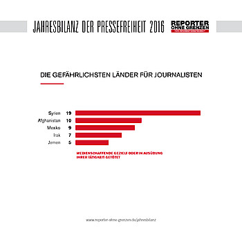 Besonders erschreckend nannte die ROG-Vorstandssprecherin Britta Hilpert, dass so viele Journalisten gezielt wegen ihrer Tätigkeit angegriffen und ermordet würden: „Diese Zahlen zeigen, wie folgenlos bisher alle internationalen Bemühungen geblieben sind, Journalisten besser vor Gewalt zu schützen.“ Die Zahl der in den letzten zehn Jahren im Zusammenhang mit ihrer Arbeit getöteten professionellen Journalisten liegt ROG zufolge bei mindestens 695. Die gefährlichsten Länder für Journalisten und andere Medienschaffende seien in diesem Jahr Syrien, Afghanistan, Mexiko, der Irak und der Jemen. Rund zwei Drittel der gewaltsamen Todesfälle dieses Jahr entfielen auf Kriegs- und Konfliktregionen.