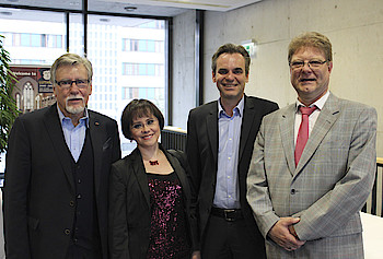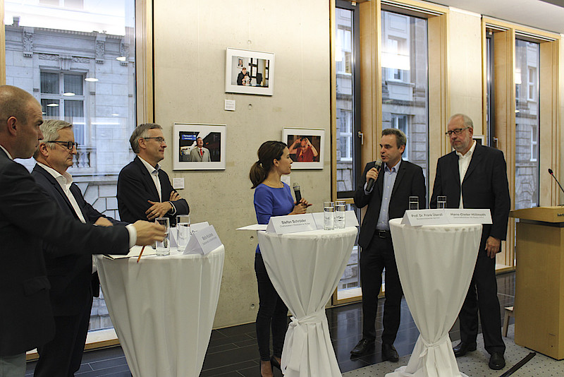 Prof. Dr. Frank Überall, Bundesvorsitzender des DJV, Malte Krückels, Bevollmächtigter des Freistaats Thüringen beim Bund, Stefan Schröder, Chefredakteur Wiesbadener Kurier, Hans-Dieter Hillmoth, Geschäftsführer Hit Radio FFH, und Jörg Quoos, Chefredakteur in der Zentralredaktion der Funke Mediengruppe, diskutierten mit Julia Held. Wie man trotz Sparens die Qualität halten könne, wollte die Moderatorin wissen. Die Antworten waren eindeutig. Durch Zusammenschluss könne man das hervorheben, was den Lesern wichtig sei, ob es sich um das Lokale oder um Spezialisten vor Ort handle. „Wir wollen kein Mittelmaß,“ bestätigte Quoos, denn die Leser bestimmten über die Qualität und kündigten ihre Abos, wenn sie diese nicht mehr erhielten. Guter Journalismus hänge von guten Fachleuten ab. „Wir suchen händeringend gute Redakteure, die das journalistische Handwerkszeug beherrschen,“ sagte Hillmoth und fügte hinzu, dass der Journalismus große Chancen für Profis biete.
