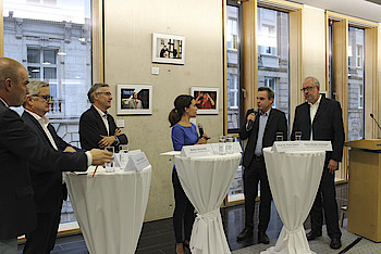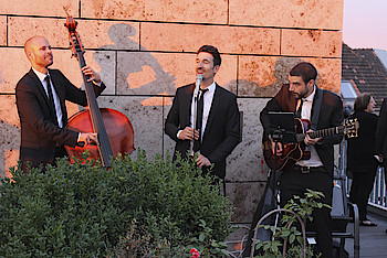 Nach einem Rundgang durch die Ausstellung wurde die Dachterrasse der Landesvertretung geöffnet. Bei Jazz, Soul und Pop der Berliner Band „Vocal Invitation“, einem kleinen Imbiss, Getränken und einem beeindruckenden Sonnenuntergang klang der Abend aus.