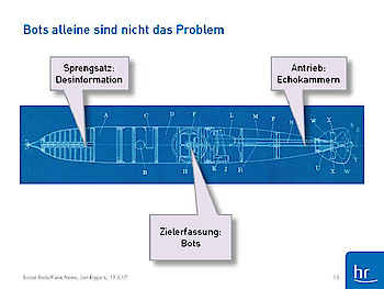 Jan Eggers bezeichnet sich spaßeshalber auch als „Nerd vom Dienst". Bei der Diskussion in Frankfurt berichtet er von „Petersburger Trollfabriken" und von XY-Einzelfall (Account, der Polizeiberichte gezielt nach Straftaten von Ausländern durchsucht). Nach seiner Beschreibung funktionieren Social Bots wie Bomben, deren Antrieb sogenannte Echokammern sind; also Kreise, die sich emotional über die Falschmeldung echauffieren und sie weiter verbreiten.