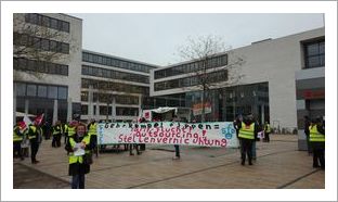 Sie folgten einem Aufruf von DJV und ver.di und legten am 6. Dezember die Arbeit nieder. Vor dem Neuen Rathaus in Gießen machten sie in einer Kundgebung klar, warum sie solidarisch mit ihren Kollegen sind. Mit dem Solidaritätsstreik bedankten sie sich bei den Druckern für deren Unterstützung in früheren Tarifauseinandersetzungen.