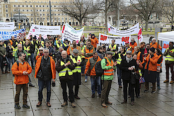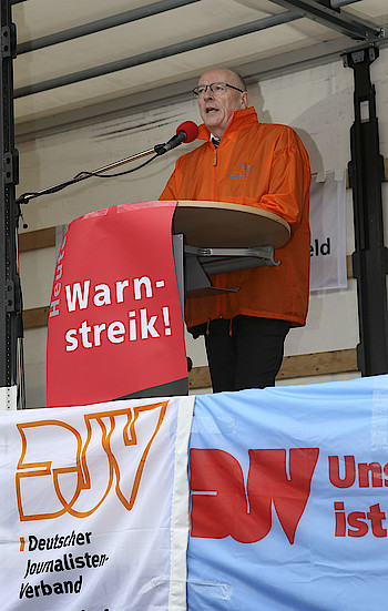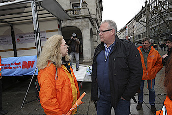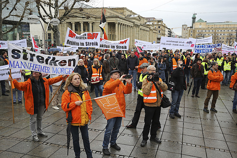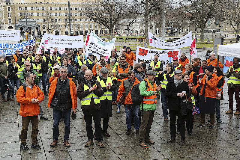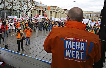 Aus Hessen waren knapp 20 Redakteurinnen und Redakteure der Frankfurter Neuen Presse dabei. Gut zwei Stunden wurde von den Streikenden darauf aufmerksam gemacht, dass von den Zeitungsverlegern ein realistisches Angebot zu den Tarifen erwartet werde. Zum Abschluss und zur weiteren Diskussion machte man sich auf den Weg ins Streiklokal. Mit einem Trillerpfeifenkonzert reagierten die Streikenden auf den zähen Fortlauf der Verhandlungen.