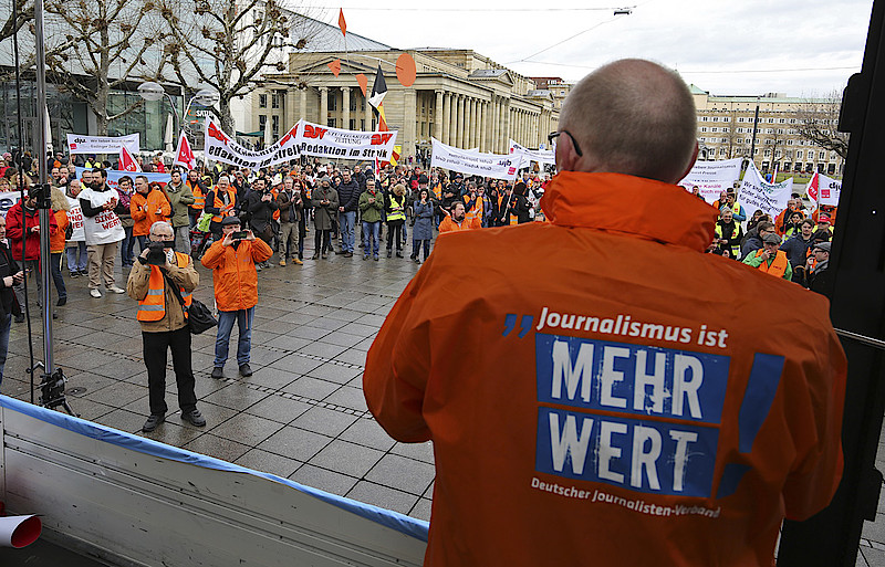 Die dritte Runde der Tarifverhandlungen für die rund 13.000 Journalistinnen und Journalisten an Tageszeitungen ging am Nachmittag in Stuttgart mit einem völlig unzureichenden Angebot des Bundesverbands Deutscher Zeitungsverleger (BDZV) zu Ende. Bei einer Laufzeit von 30 Monaten bot der BDZV einen Gehaltstarifvertrag mit insgesamt 2,6 Prozent mehr Gehalt und 120 Euro mehr für Jungredakteure, nicht jedoch für Volontäre. Als Erhöhungstermine benannten die Verleger den 1. August dieses Jahres und den 1. August 2019. Der Manteltarifvertrag sollte um ein Jahr bis Ende 2019 verlängert werden. „Das sogenannte Tarifangebot entspricht einer jährlichen Gehaltssteigerung um 1,04 Prozent – ein schlechter Witz“, sagte DJV-Verhandlungsführer Kajo Döhring.