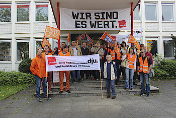 Von dort ging es zum Gewerkschaftshaus in der Rheinstraße. Die Fahnen und Trillerpfeifen des DJV und der dju in ver.di machten darauf aufmerksam, dass auch nach der 4. Runde der Tarifverhandlungen noch immer kein Ergebnis zustande kam.