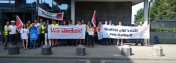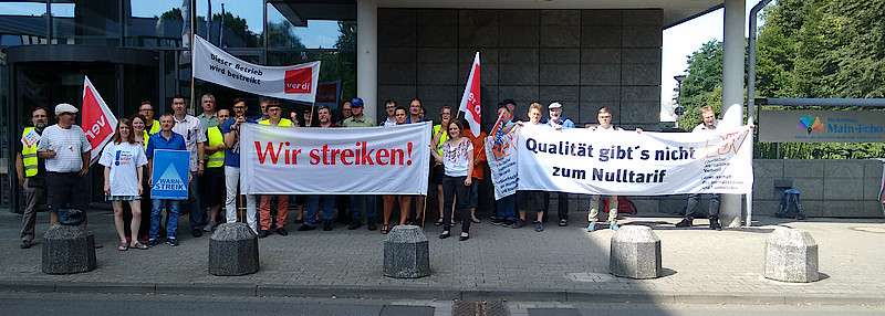 Aus Hessen waren Mitarbeiterinnen und Mitarbeiter der Frankfurter Neuen Presse und ihrer Bezirksausgaben zum Verlagsgebäude des Main-Echo gekommen, um mit den bayrischen Kolleginnen und Kollegen den Forderungen nach mehr Gehalt und höheren Honoraren Nachdruck zu verleihen. Die Forderungen der Gewerkschaften lauten zweimalige Tariferhöhung (Gehälter und Honorare) um jeweils 2,8 Prozent in einem zweijährigen Tarifabschluss. Mindesterhöhung der Berufseinstiegsgehälter um 150 Euro, für Volontärinnen und Volontäre um 100 Euro im ersten Laufzeitjahr;im zweiten Jahr eine Erhöhung von 2,8 Prozent.