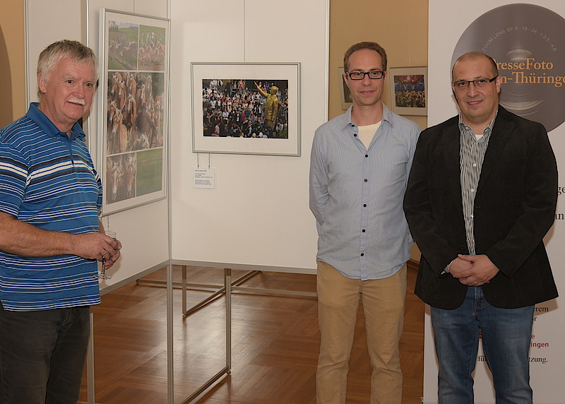 Alleine in den sozialen Medien werden täglich Hunderte Millionen Fotos hochgeladen. „Um unter diesen Massen mit seinem Bild aufzufallen, gehört einiges dazu“, erklärte Ralf Leifer, Geschäftsführer des DJV Thüringen. Er führte die Gäste durch die Ausstellung und lieferte die Geschichten zum Bild. Wie zum „Foto des Jahres 2018“, welches eine aus der bunten Masse der Zuschauer herausragende vier Meter hohe, goldene Statue des türkischen Präsidenten Recep Tayyip Erdogan zeigt. Dem dpa Redakteur Arne Dedert gelang dieses Bild anlässlich des Kulturfestivals „Wiesbaden Biennale“. Dafür beobachtete er die Szene über mehrere Stunden, seine Geduld hat sich ausgezahlt.