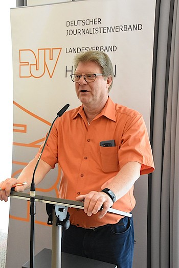 Der stellvertretende Bundesvorsitzende Wolfgang Grebenhof rechtfertigte vor den hessischen Delegierten die erhöhte Abgabe an den Bundesverband, bekräftigte eine Strukturreform für die es unterschiedliche Möglichkeiten gebe – nicht nur die kühnen Ideen und rief dazu auf, sich weniger mit den Themen innerhalb des Verbandes als vielmehr sich mit den Herausforderungen von außen zu beschäftigen wie Pressefreiheit oder den weltweit professionell produzierten Lügen.