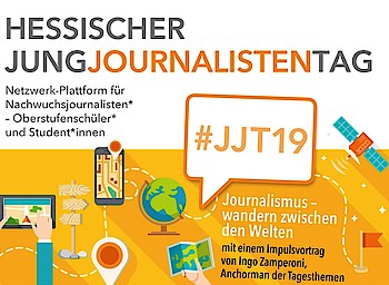 Mit den Kooperationspartnern evangelische Medienakademie Hörfunkschule Frankfurt, Frankfurter Presseclub, HMKW, Jugendpresse Hessen, LPR, Wiesbadener Presseclub, und dem VHZV führt der Deutsche Journalisten-Verband Hessen den #JJT19 zum fünften Mal durch.