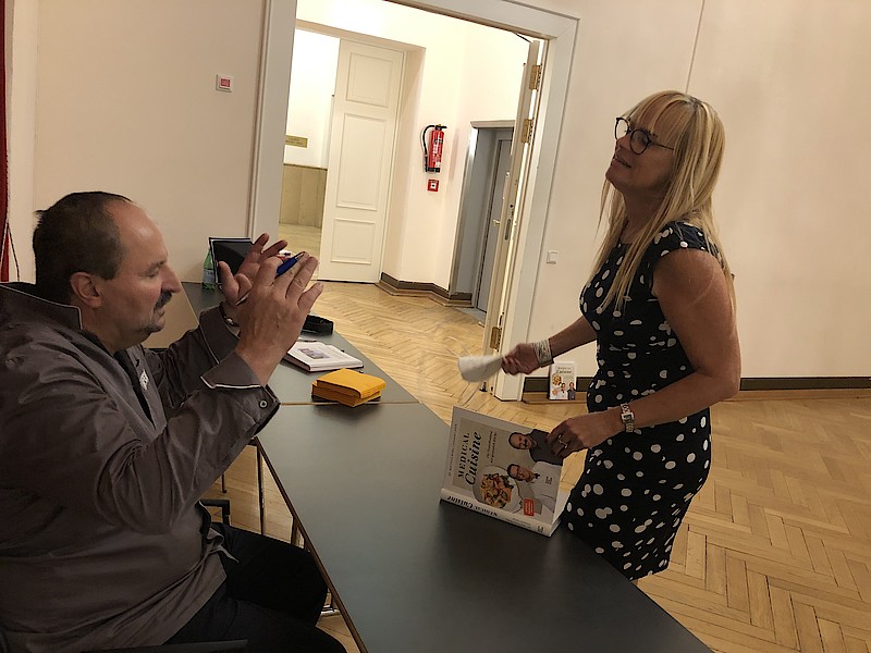 Gabi Blumschein, Schatzmeisterin des DJV-Hessen in angeregter Unterhaltung mit dem Koch und Autor Johan Lafer