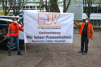 „Frankfurt bleibt stabil.“ Mit diesem letzten Tweet beendete die Frankfurter Polizei am Sonntagabend ihren Einsatz auf dem Rebstockgelände und in den sozialen Netzwerken. Dort hatten sich nach der kurzfristigen Absage einer Demonstration gegen die angebliche Gleichschaltung der Medien durch den Veranstalter, das Bündnis „Querdenken 69“, letztlich doch noch an die 400 Teilnehmer zusammengefunden, die kurzfristig einen weiteren Protest angemeldet hatten. Gegen deren ursprüngliches Ziel, direkt vor dem Hessischen Rundfunk zu protestieren, hatte spontan auch der DJV-Landesverband mobil gemacht. An die 50 Mitglieder verteidigten in einem friedlichen Protestzug die Pressefreiheit.