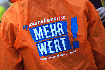 „Gleichgeschaltete Medien in Deutschland – wer so etwas denkt, hat gleich mal gar keine Ahnung“, erklärte Landesvorsitzender Knud Zilian auf der Abschlusskundgebung direkt vor dem hr-Hauptgebäude. Dieses war von einem massiven Polizeiaufgebot gesichert, Zufahrtstraßen waren abgesperrt, Zugänge kontrolliert worden. Zilian dankte der Eskorte aus Nordrhein-Westfalen, die den DJV-Protestzug sicherte. Teilnehmer an der DJV-Demonstration wurde der Zugang unkompliziert gewährt.