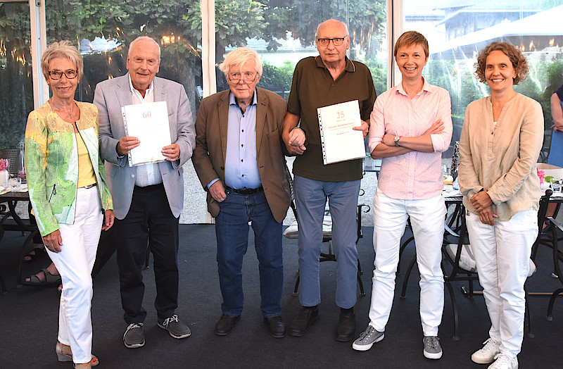 „Spitzenreiter“ Claus Seibel ist seit 60 Jahren DJV-Mitglied. Im lockeren Plausch mit Sylvia Kuck blickte der frühere heute-Nachrichtenmoderator, der Mitte September seinen 85. Geburtstag bei bester Gesundheit feiern kann, zurück und voraus. Vor einem halben Jahrhundert ist Seibels frühere ZDF-Kollege Dieter Zimmer, in Erinnerung vor allem als Statistiker an Wahlabenden, dem Ortsverband beigetreten – ebenso wie Ingrid Weber und Bernd Stefan Lormann. Auf 40 Jahre kommen Heinz-Harald Löhlein und Heike Kaiser. Elf Mitglieder feiern dieses Jahr Silberjubiläum mit dem DJV: SWR1-Leute Moderatorin Claudia Deeg, Petra Spielberg, Bettina E. Witte, Bernd Glebe, hr-Moderatorin Sabine Elke-Geisen, der Vize-Ortsverbandsvorsitzende Wolfgang Kühner, Immobilienexpertin Alexandra May, Sascha Zoske, Jürgen Strickstrock, Hannelore Wiedemann und die frühere IBM-Pressesprecherin Ingrid Kron. Unter die Gratulanten reihte sich auch Landesvorsitzender Knud Zilian ein. ala
