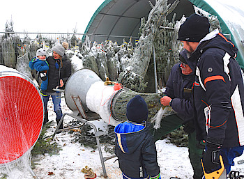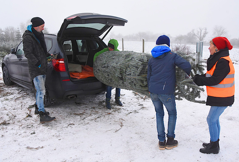 Ganz einfach: Baum in der Plantage aussuchen und dann Axt bzw. Säge anlegen. Wer Hilfe braucht beim Aussuchen und Sägen wird begleitet. Bernards hat sich schnell entschieden und trägt sein Prachtstück zur Halle. Hier wird der Baum ins praktische Transportnetz gesteckt. An der Kasse macht es für jede Nordmanntanne 25 Euro. Die Größe spielt keine Rolle. Diesen Preis hat Volker Bücher seit Jahren für uns vom DJV nicht erhöht. Solche Zahlen erfreuen natürlich die Schatzmeisterin des DJV-Hessen: Auch Dr. Gabriela Blumschein genießt die Atmosphäre in der Plantage und den Glühwein.