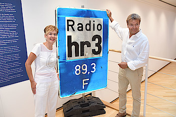 Jörg Bombach, 22 Jahre lang hr3-Chef, führte Kolleginnen und Kollegen durch die begleitende Schau „Funk für Fans“. Diese zeigt bis zum 4. September Schätze aus den hr-Archiven, Fotos von den legendären Disco-Parties und auch Autogrammkarten von Jörg Bombach und Peter Lack.