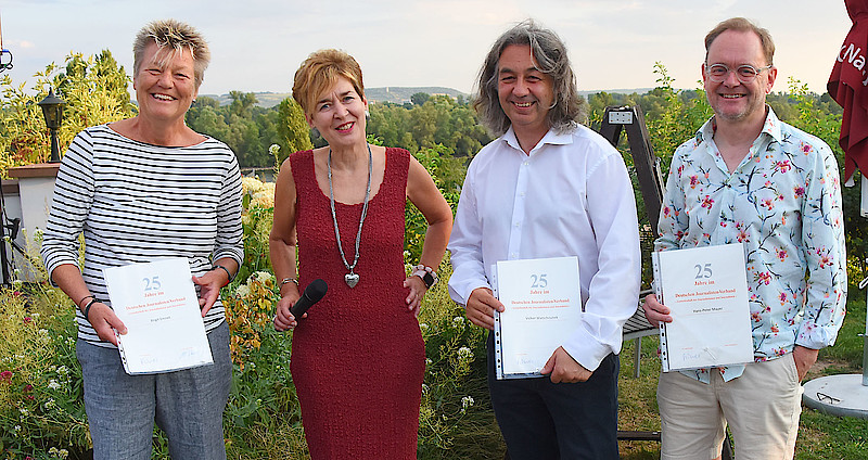 Bei Sekt, Wein und guter Laune wurde viel über aktuelle Landespolitik und Veränderungen in Medienhäusern diskutiert. Außerdem gab es Urkunden für langjährige Mitgliedschaft im DJV-Hessen.