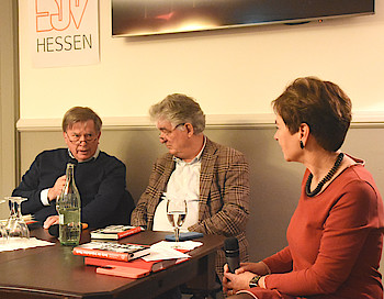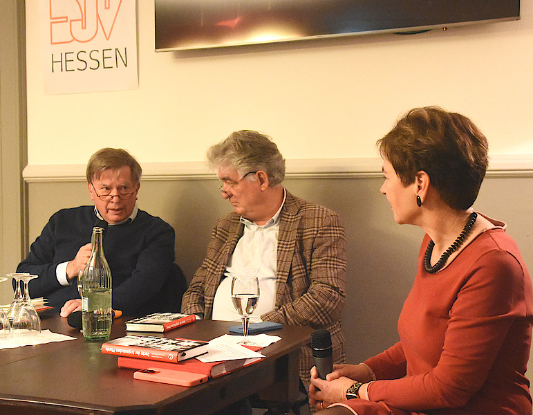 In „Derby der trojanischen Pferde - eine Finanzgroteske“ haben die beiden Journalisten all ihr Wissen über die heiklen Machenschaften um den milliardenschweren Steuerbetrug im Cum-Ex-Skandal gepackt. Es geht um Monopole, Dividendenstripping, Zinsswaps, Leerverkäufe - verwirrende Aktien-Deals häufig am Rande der Legalität. Das schließt die oftmals „unheilige Allianz“ zwischen maßlosen Investmentbankern und käuflichen Spitzenpolitikern ein. Herausgekommen ist ein „Märchen“, das im Wesentlichen in Hessen, im Spannungsfeld zwischen der Landesregierung in Wiesbaden und dem Finanzplatz Frankfurt spielt. Die Lesung und Diskussion mit den beiden Autoren war ein Hintergrundgespräch, zu dem der DJV-Ortsverband Wiesbaden eingeladen hatte.