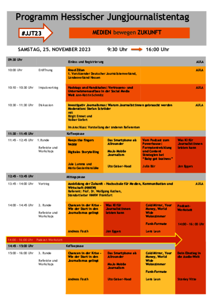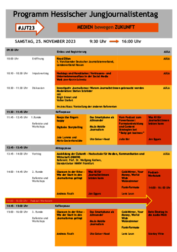 „Medien bewegen Zukunft“ – Warum Journalistinnen und Journalisten gebraucht werden – ist das Thema des diesjährigen Hessischen Jungjournalistentages. Der #JJT23 bietet die exklusive Gelegenheit Medienmacher und Entscheider von heute persönlich kennenzulernen und Kontakte zu knüpfen.