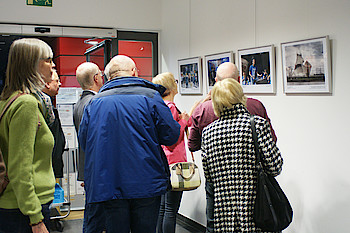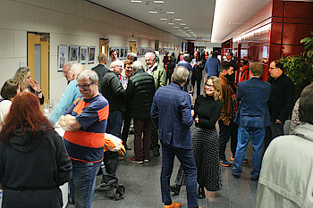 Sechzig Gäste, Kollegen, DWD-Mitarbeiter und Offenbacher Bürger diskutierten anschließend bei einem Rundgang durch die Ausstellung, mit Brezel und Wein, in kleinen Gruppen über die Inhalte der Bilder.