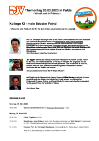 Chancen und Risiken der künstlichen Intelligenz für den freien Journalismus im Lokalen sollen am Montag, 20. März, in einer fünstündigen hybrid Veranstaltung des DJV vorgestellt werden. Als Experten sind Jan Eggers, Datenjournalist des hr, und der zweite DJV-Vorsitzendende Mika Beuster eingeladen. Beuster ist Digitalchef der Nassauischen Neuen Presse.